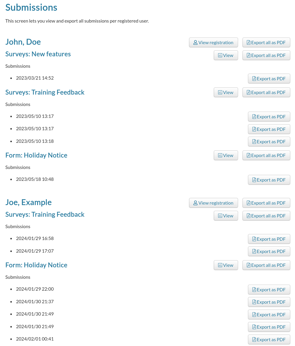 From here you can view the results, or export one or more submissions as PDF.
